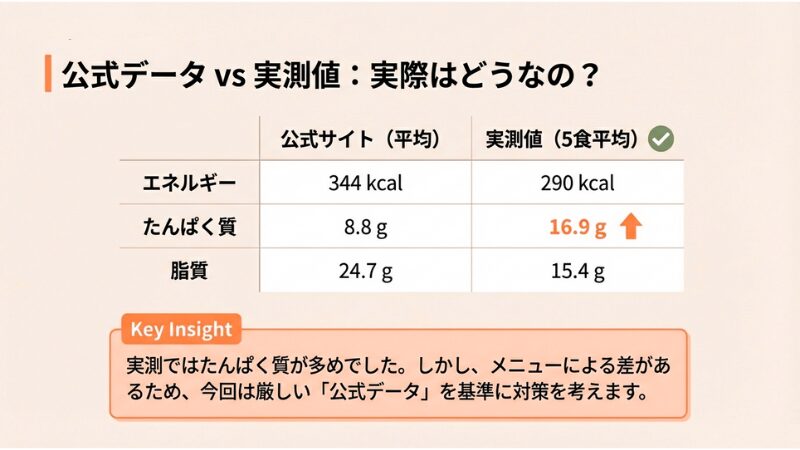 ただし、これはあくまで一例です。メニュー構成によって栄養量は変わるため、この記事ではあえて厳しい「公式データ」を基準に、対策を考えていきます。