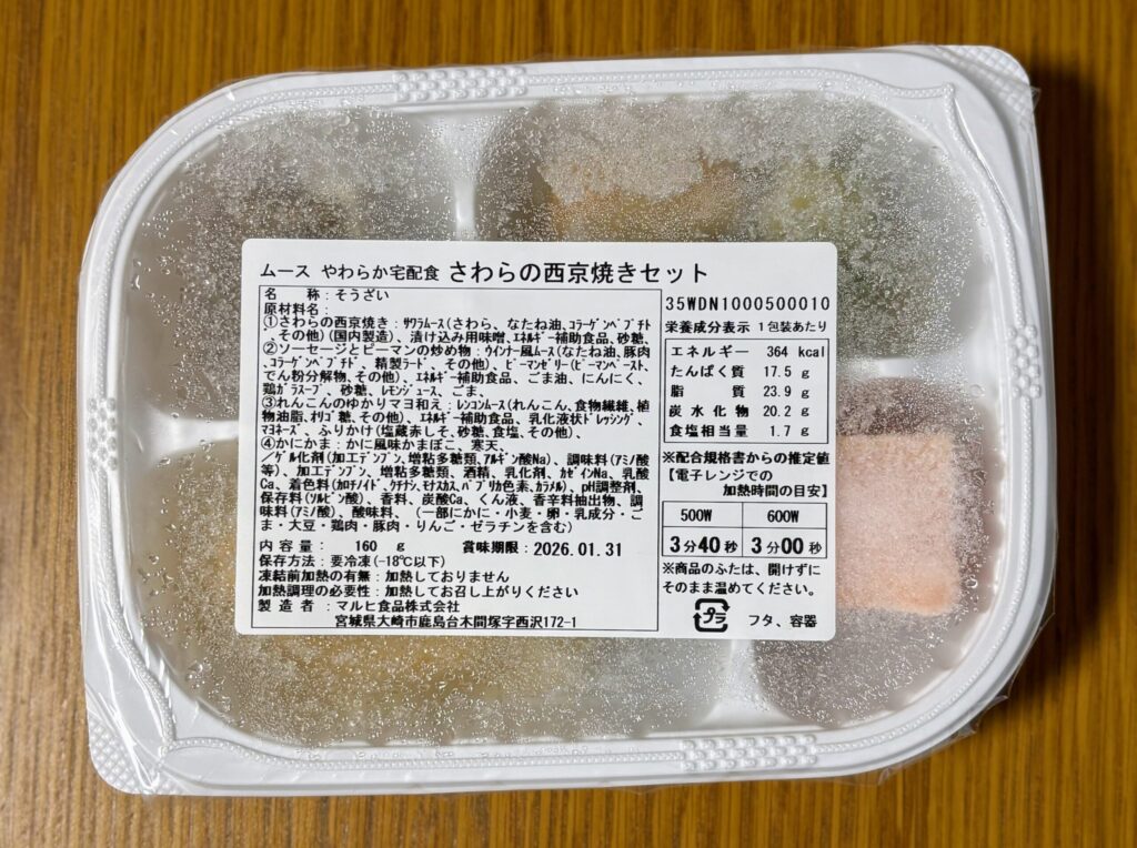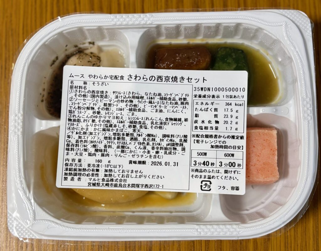ウェルネスダイニングのムースやわらか宅配食「さわらの西京焼きセット」は、想像以上にしっかりした味付けで、美味しかったです。副菜もそれぞれ味つけが違い、飽きずに食べられる工夫が感じられました。