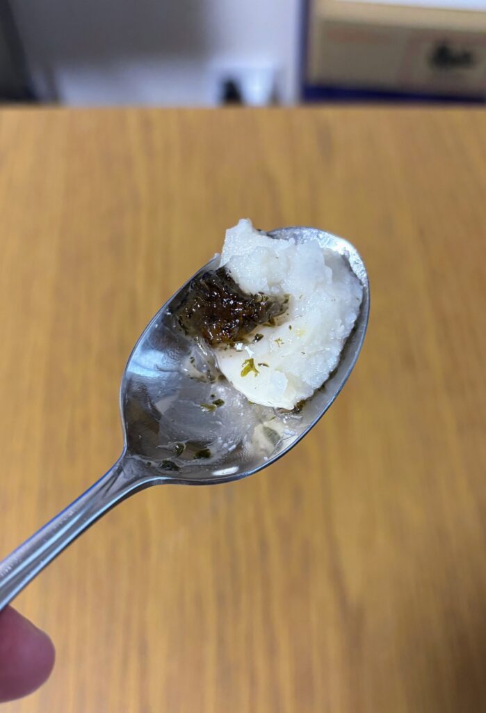 舌触りはねっとりした感じでした。海苔に見えるのは「ゆかりマヨ」です。