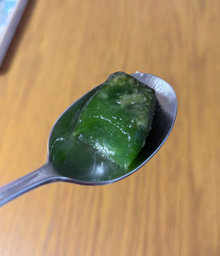 こちらもしっかりした味付けでした。ピーマンの味だけではなくちゃんと「炒めもの」がしました。舌触りは他のものよりツルンとした感じです。